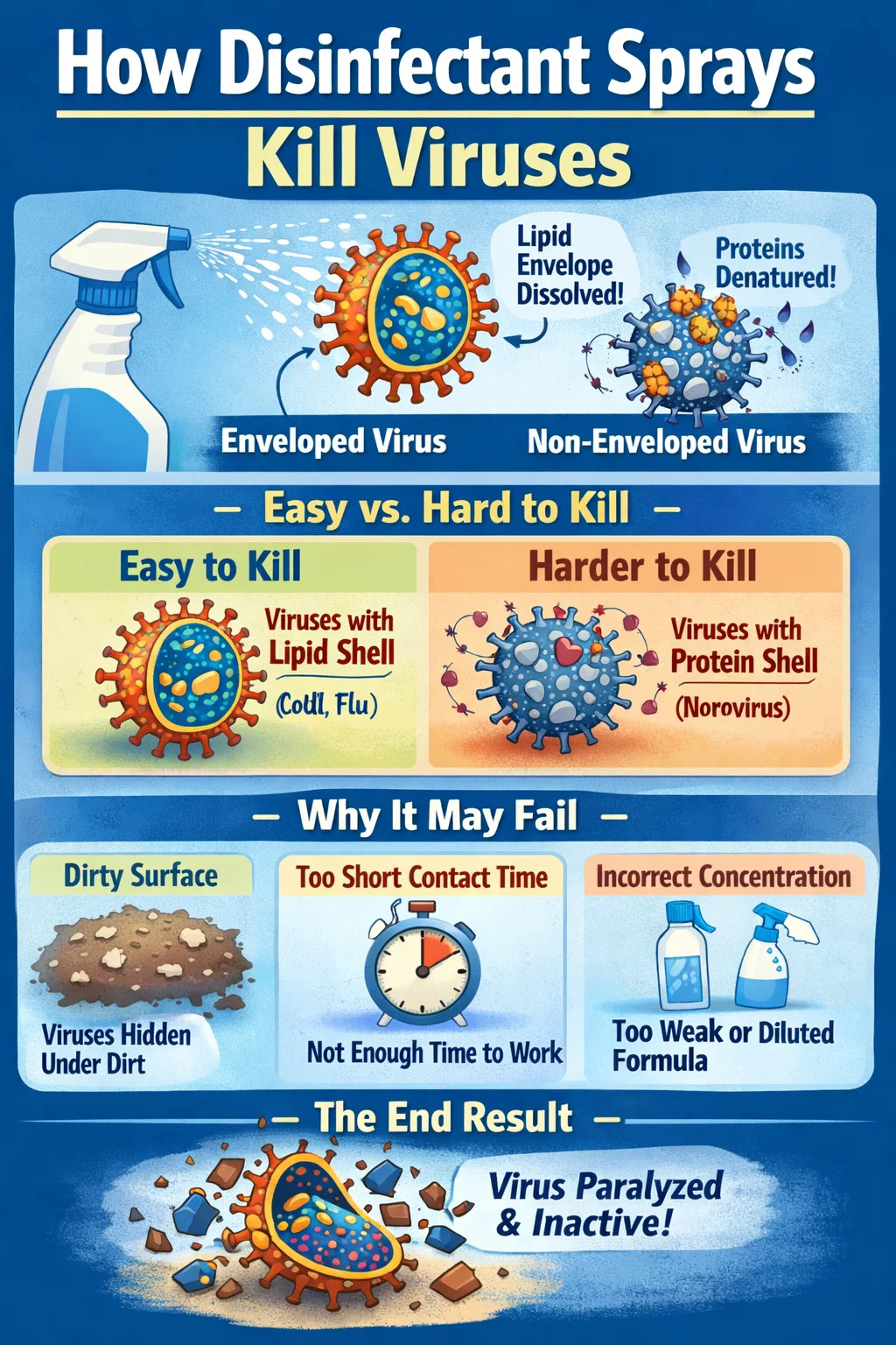 Desmantelamiento de la "capa exterior": muchos virus (como los del resfriado común) tienen una "envoltura" exterior compuesta de lípidos y proteínas. Los componentes de alcohol o sales de amonio cuaternario del spray actúan como potentes detergentes y disuelven rápidamente esta capa lipídica. Sin este caparazón, el material genético interno del virus queda expuesto, volviéndose extremadamente vulnerable y perdiendo rápidamente su capacidad de infectar.