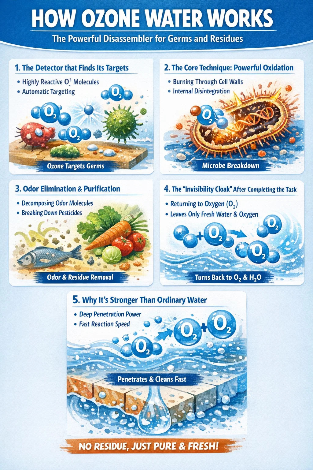 Descomposición de moléculas de olor: el agua con ozono no solo mata las bacterias sino que también combate los olores desagradables. Cambia la estructura de las moléculas de olor, descomponiendo sustancias malolientes (como el olor a pescado y a moho) en componentes inodoros.