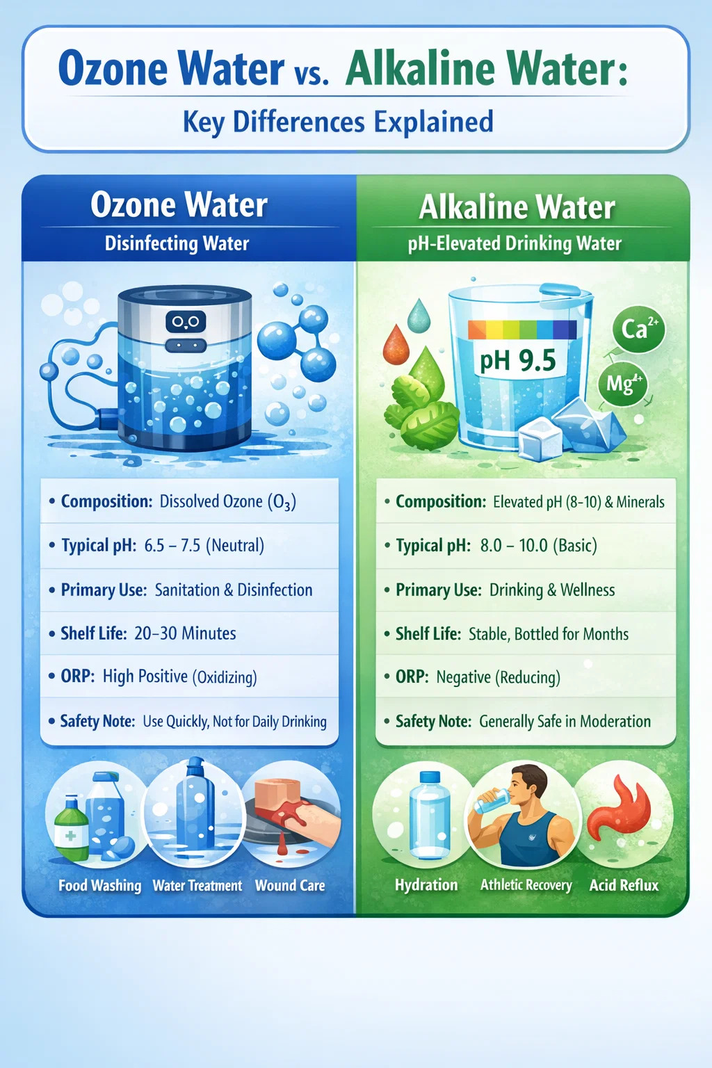 La propiedad definitoria del agua alcalina es su pH, no su potencial de oxidación, ni sus efectos antibacterianos, ni su contenido de ozono. No hay ozono en el agua alcalina y los dos productos no comparten ninguna superposición química significativa.