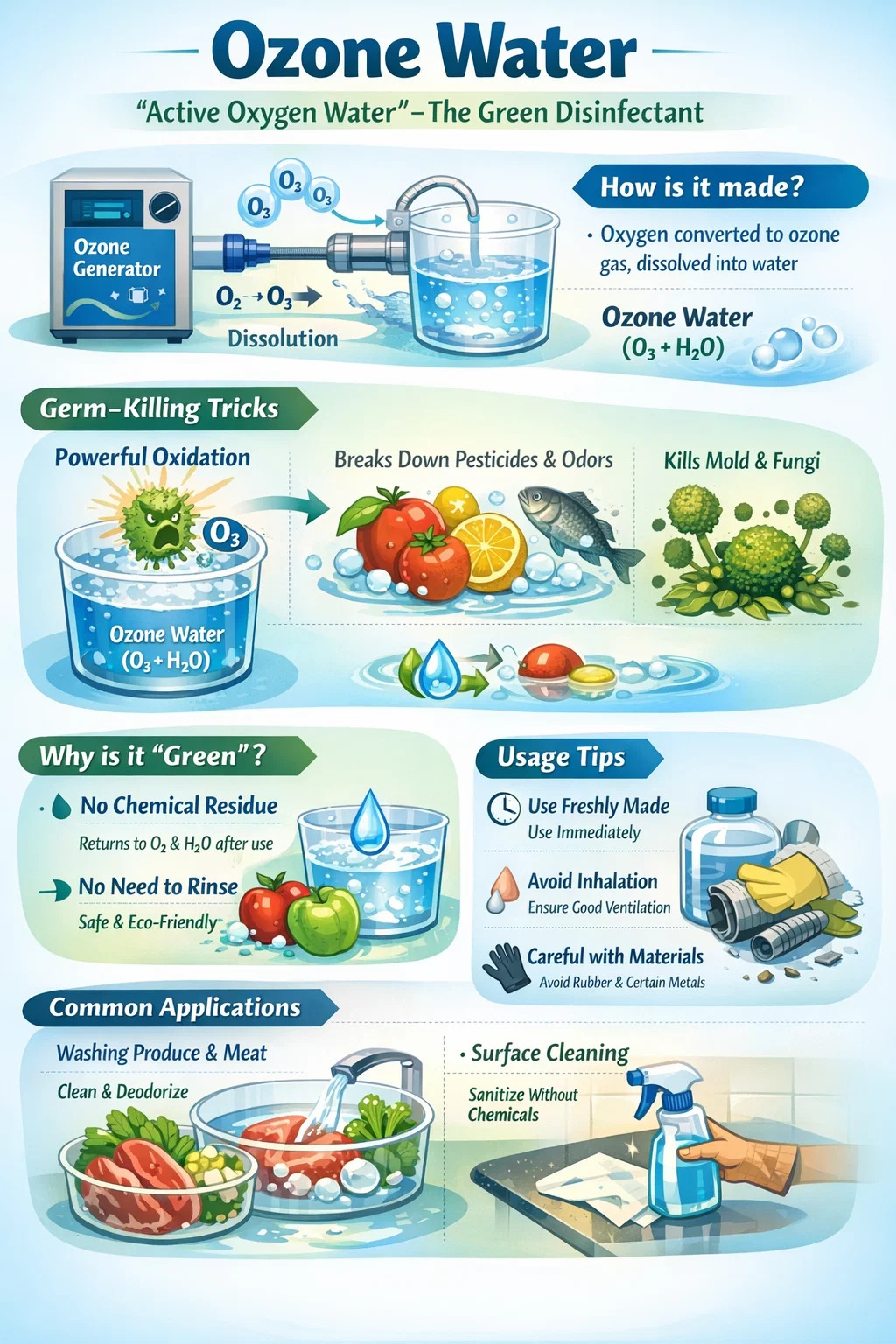 agua ozono es un líquido que se forma al disolver gas ozono en agua corriente, lo que da como resultado una sustancia con potentes capacidades limpiadoras y desinfectantes. A menudo se la denomina en sentido figurado "agua con oxígeno activo" o "desinfectante verde".